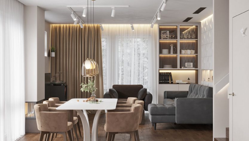 Придерживаясь концепции единого цвета или тоновых переходов, можно соединить контрастные предметы мебели. Классический диван с элементами рэтро идеально будет смотреться рядом с современным столом из стекла. Главное, чтобы цвета и материалы гармонировали, создавая непрерывный поток настроения по всему помещению.